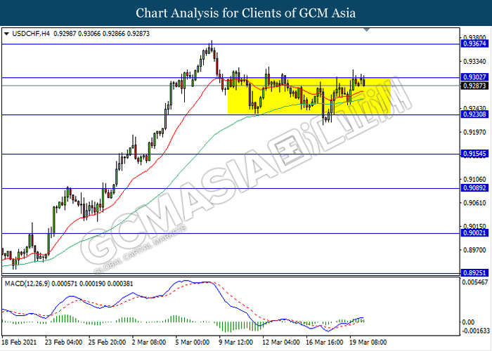USDCHF, H4: USDCHF remain traded in a sideway channel while currently testing near the resistance level 0.9300. However, MACD which illustrate diminishing bullish momentum signal suggest the pair to be traded lower towards the support level 0.9230.