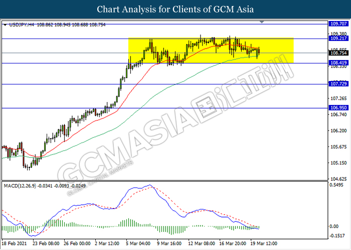 USDJPY, H4: USDJPY remain traded in a sideway channel while currently heading towards the support level 108. 40. However, MACD which display bearish momentum signal suggest the pair to be traded lower after it breaks below the support level.