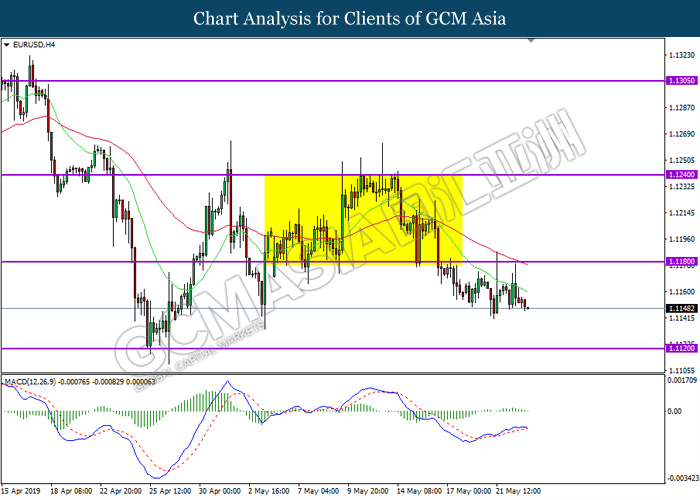 EURUSD, H4: EURUSD was traded lower following prior retracement from the resistance level 1.1180. MACD which display bearish bias signal suggest the pair to extend its retracement towards the support level 1.1120.