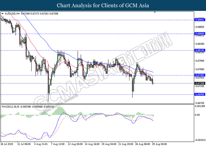 New Zealand dollar extended its losses during Asian trading session following the release of bearish economic data from the region. For the month of August, ANZ reported that Business Confidence in New Zealand slumped to -52.3, significantly lower than previous month’s reading of -44.3. Deteriorating business confidence is largely contributed by ongoing trade dispute in between US and China which may drag global economic momentum if it persists for a longer period of time. As New Zealand mainly exports to Australia whom also economically dependent on China, recent escalation in trade war has dialed down market sentiment towards both Antipodean currencies. As of writing, pair of NZD/USD slumped 0.28% to 0.6319. On the other hand, safe-have currencies such as Japanese Yen regained its demand in the FX market following higher risk aversion among traders. Extended recessive risks while coupled with political jitters in the UK has sparked a shift in portfolio into safe-havens. For the time being, investors will keep an eye on tonight’s US GDP data in order to gauge the economic performance of one of the world’s largest economy. Pair of USD/JPY was down 0.21% to 105.89.