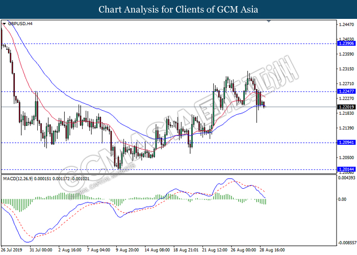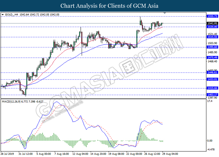 As for commodities market, crude oil price slumped 0.59% to $55.62 per barrel. Bearish momentum overtakes oil futures due to lingering trade war risk in between US and China that sees no end. Otherwise, gold price extended gains by 0.13% to $1,541.13 a troy ounce due to higher risk aversion in the market.