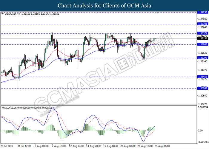 USDCAD, H4: USDCAD was traded higher following prior breakout above the previous resistance level 1.3335. MACD which illustrate persistent bullish momentum signal suggest the pair to extend its gains towards the resistance level 1.3335.