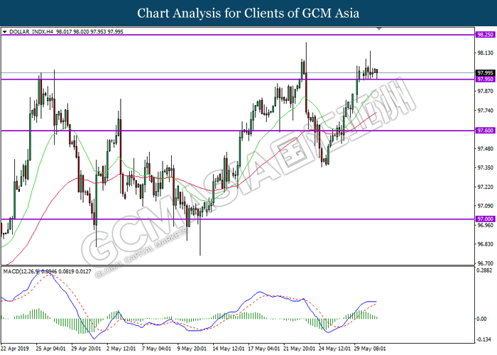 Dollar index which gauge its value against a basket of six major currencies hovered around two years high level at $98.00 amid mixed data has ‘stunned’ the market sentiment toward greenback. According to Bureau of Economic Analysis, US first quarter of GDP was came in at a reading parallel to economist forecast of 3.1% while data showing significant growth in consumer spending, government spending and net exports. Growth in GDP indicating that US economy is still remain resilient and consumers are still optimistic toward the economy outlook in short term. However, Greenback did not receive a momentous demand from the market as the GDP data reflected the economy activity and health of US in first quarter of 2019, before the current escalation of the US China trade war. Besides, appealing of dollar index dragged down further amid downbeat US Pending Home Sales data, where the reading was -1.5%, weaker than economist forecast 0.9%. During early Asian trading hours, Dollar Index inched down 0.02% to 98.00 while the pair of USD/CAD surged 0.23% to 1.3530 amid crude oil price dropped significantly.