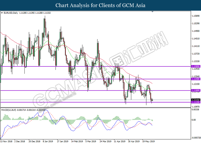 EURUSD, Daily: EURUSD was traded lower while currently testing near the support level 1.1120. MACD which display bearish momentum with the formation of death cross suggest the pair to extend its losses after successfully breaking below the support level.