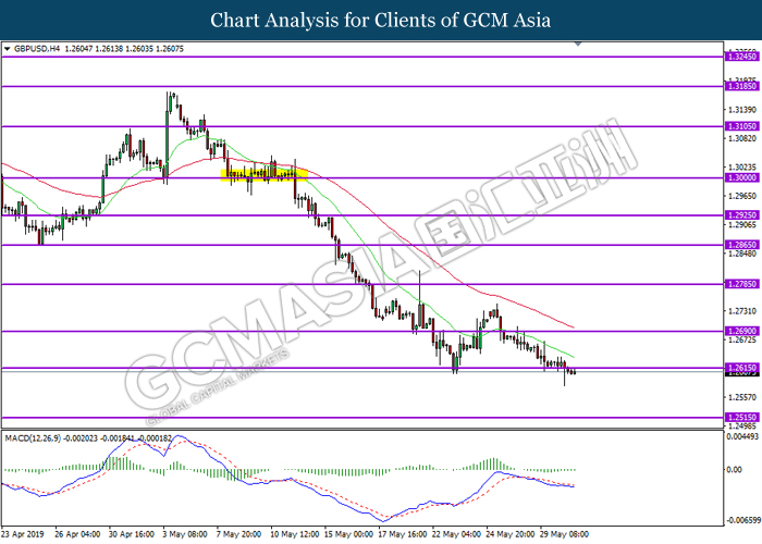 GBPUSD, H4: GBPUSD was traded lower while currently testing near the support level 1.2615. Due to lack of momentum from the MACD, a breakout below or rebound from the support level is required for further confirmation before entering the market.