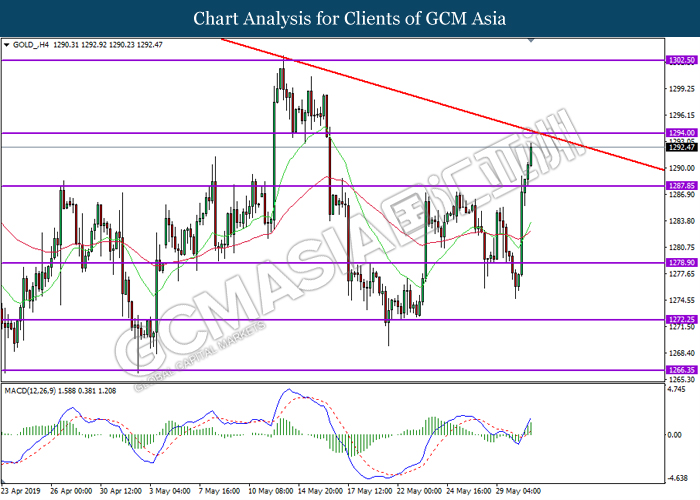 GOLD_, H4: Gold price was traded higher while currently testing near the resistance level at 1294.00. MACD which display persistent bullish momentum suggest gold to extend its gains after successfully breaking above the resistance level.