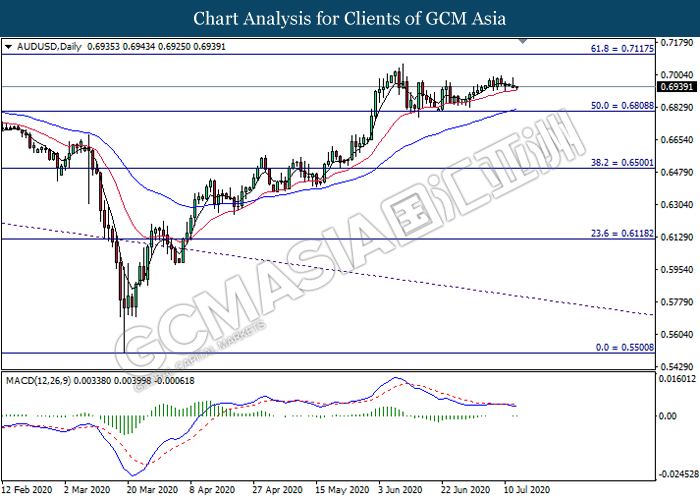AUDUSD, Daily: AUDUSD was traded lower following prior breakout below the upward trendline. Due to lack of signal from MACD, it is suggested to wait for further confirmation before entering into the market.