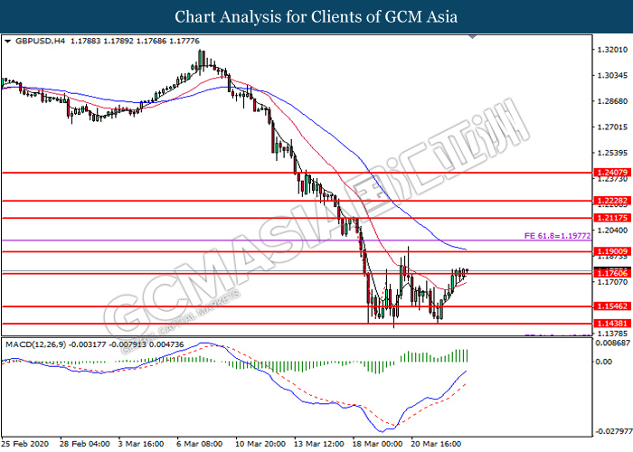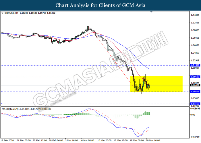 GBPUSD, H4: GBPUSD was traded in a sideway channel. However, MACD which illustrate bullish momentum signal with the recent formation of golden cross suggest the pair to be traded higher in short term towards the resistance level 1.1860.