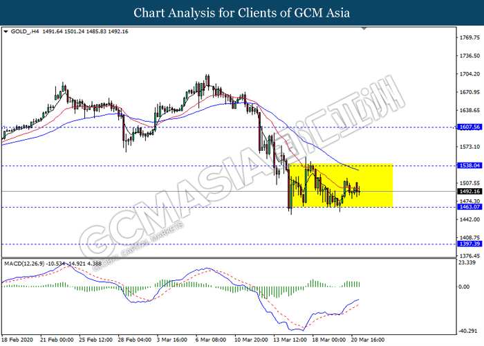 In the commodities market, crude oil prices depreciated by 9.18% to a barrel of $21.10 following few largest economy bodies ordered a lockdown in their country in order to restrict the negative effect of pandemic, putting the prospect of oil’s demand in ‘dark zone’. Besides, gold price inched down by 0.33% to 1,493.20 a troy ounce after US stock futures limit down lately, as markets threw off their gold’s holding to avoid the risk of margin call.