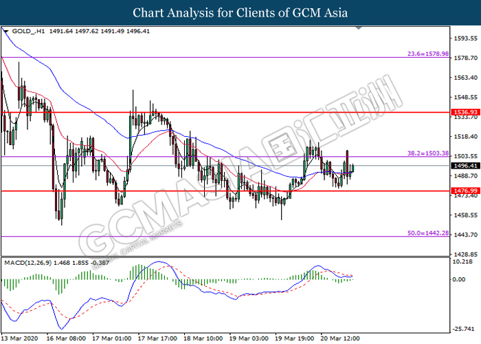 GOLD_, H1: Gold price was traded higher following prior rebound from the support level at 1477.00. MACD which illustrate diminishing bearish momentum signal suggest the commodity to extend its gains toward the resistance level at 1503.40.