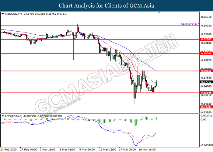 NZDUSD, Daily: NZDUSD was higher following prior rebound from the support level at 0.5635. MACD which illustrated diminishing bearish momentum suggest the pair to extend its gains toward resistance level at 0.5840