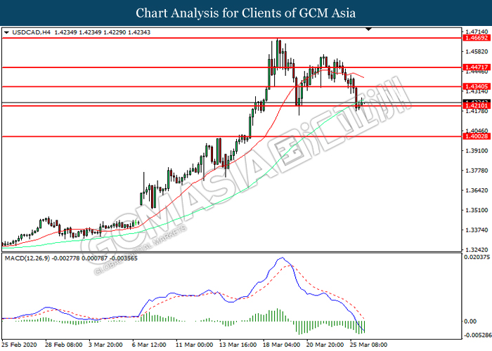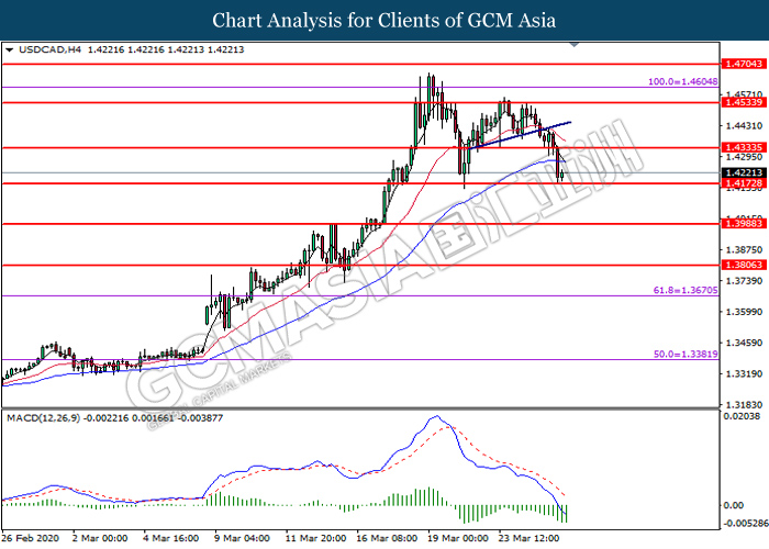 USDCAD, H1: USDCAD was traded lower following prior retracement from the higher level. MACD which illustrate diminishing bullish momentum signal suggest the pair to extend its losses toward the support level at 1.4325.
