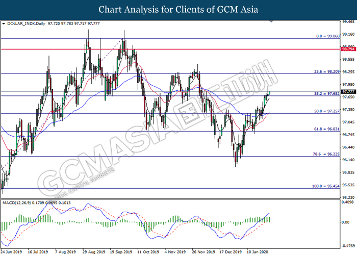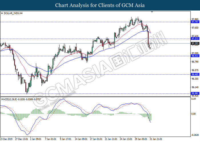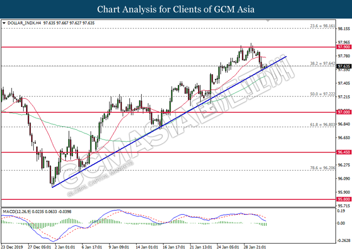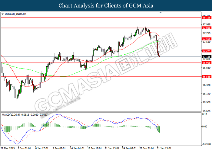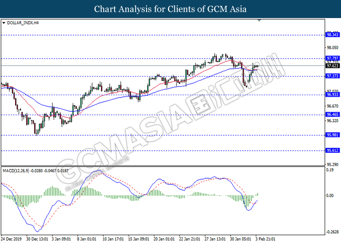 Dollar index surged yesterday following the U.S. Central Bank announced that they would leave the interest rate unchanged while providing hawkish statement which claiming that the jobs market in the United States still remained strong. Besides that, the uncertainty about the impact of the outbreak of the corona virus had stoked a shift in sentiment towards safe-haven asset, which spurred some significant demand for the US Dollar. According to CNBC, China’s National Health Commission confirmed an additional 38 deaths and 1,737 new cases had infected by the corona virus. China government reiterated that it had increased to the total of 170 deaths and 7,711 cases with regards of the virus while 170 people had been cured and discharged from the hospital. However, the gains experienced by the US Dollar was limited following the released of the bleak housing data from the United States. According to National Association of Realtors, U.S. Pending Homes Sales for last month notched down from the previous reading of 1.2% to -4.9%, missing the economist forecast at 0.5%, dialing down the market optimisms towards the economic progression in the United States. As of writing, the dollar index appreciated by 0.04% to 97.80.