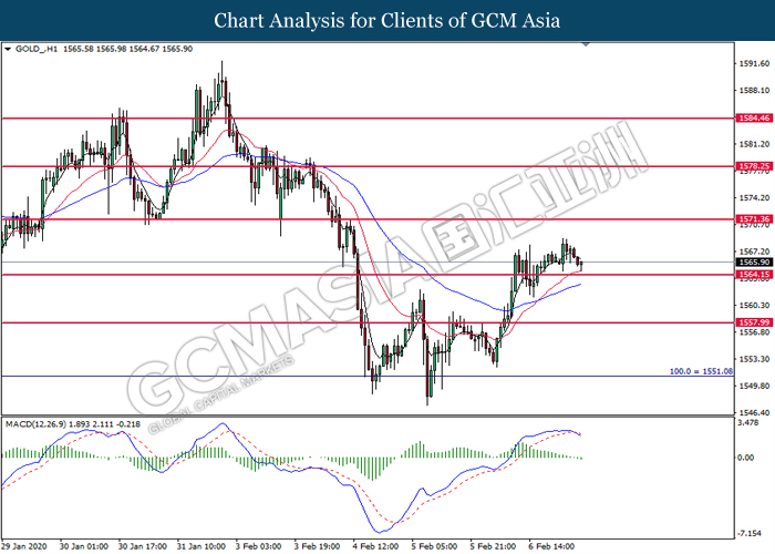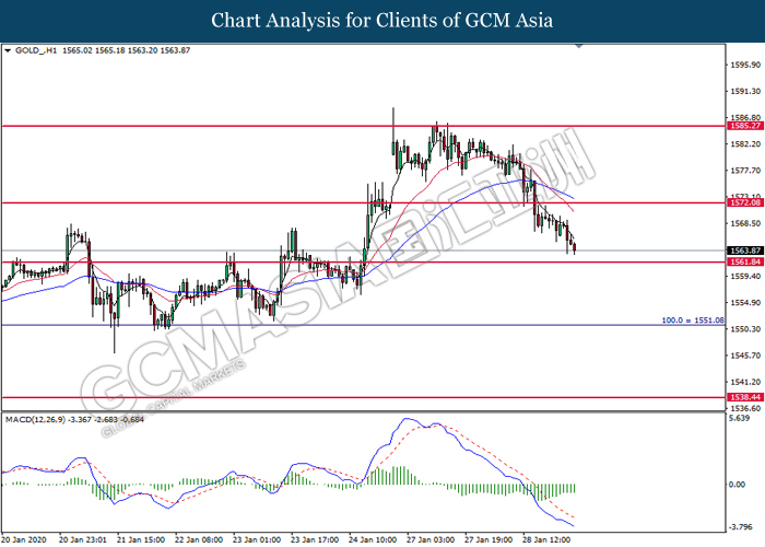 GOLD_, H1: Gold price was traded lower following prior retracement from the higher level. MACD which illustrate bearish momentum suggests its price to be traded lower toward the support level at 1564.15.