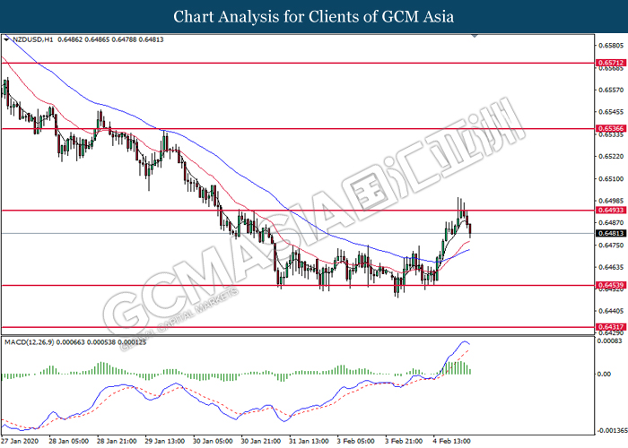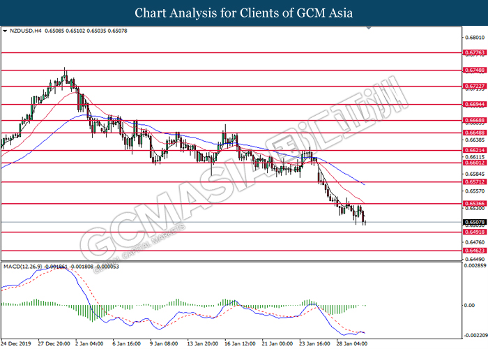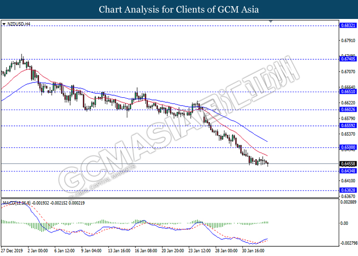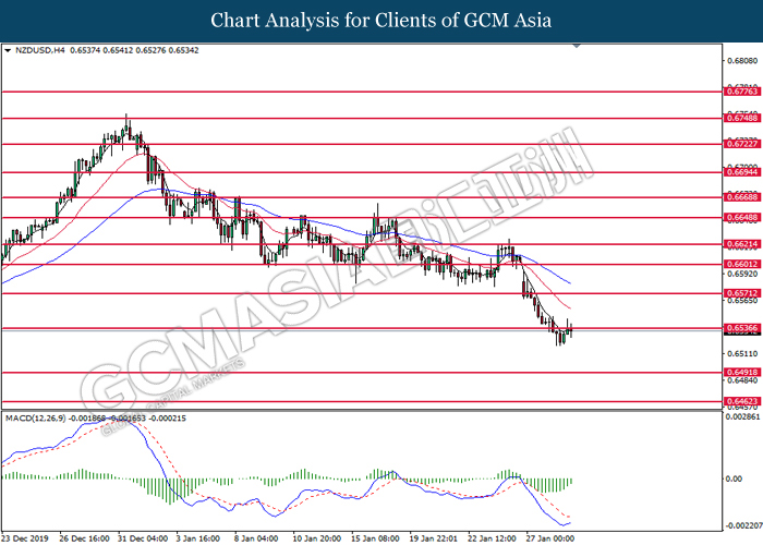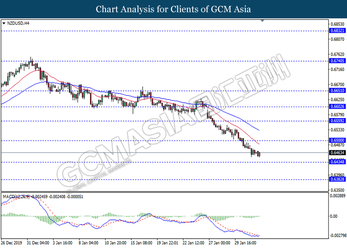 NZDUSD, H4: NZDUSD was traded lower following prior retracement from the resistance level at 0.6535. Due to lack of signal from MACD, it is suggested to wait for further confirmation before entering into market.