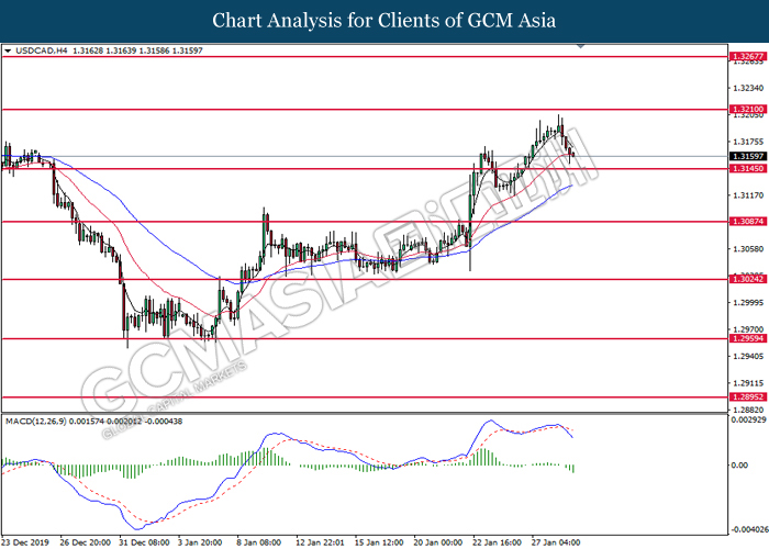 USDCAD, H4: USDCAD was traded lower following prior retrace from its higher level. MACD which begin to form bearish signal suggests the pair to extend its losses toward the support level at 1.3145.