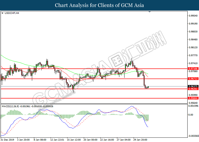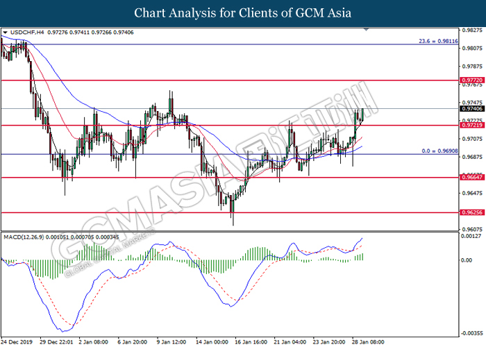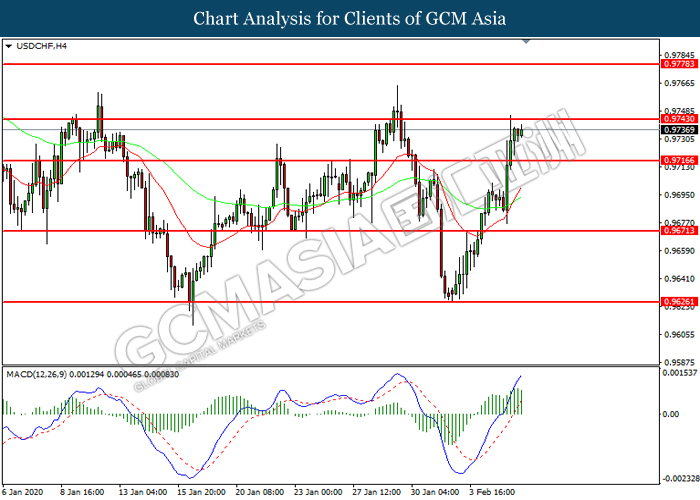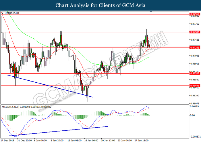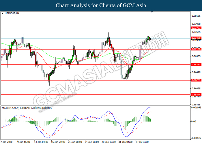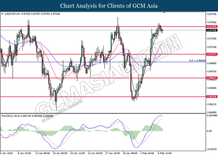 USDCHF, H4: USDCHF was traded higher while currently testing the resistance level at 0.9750. However, MACD which illustrated diminishing bullish momentum suggest the pair to be traded lower in short-term as technical correction.