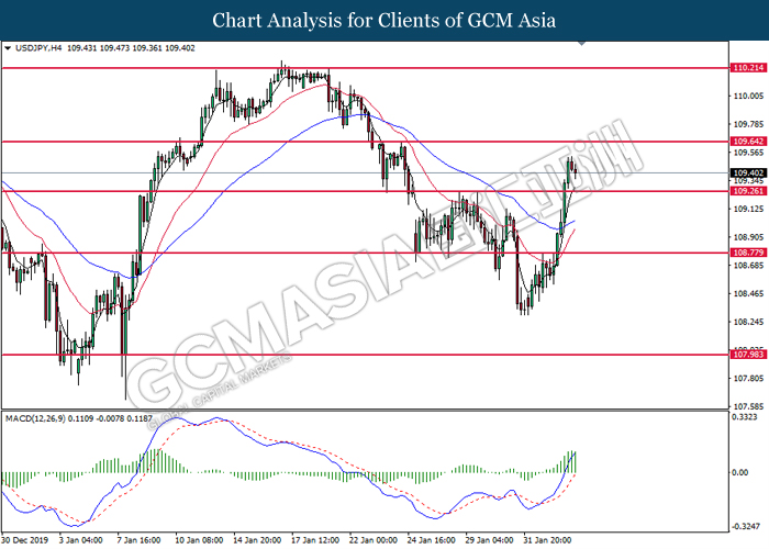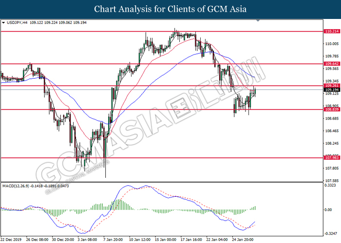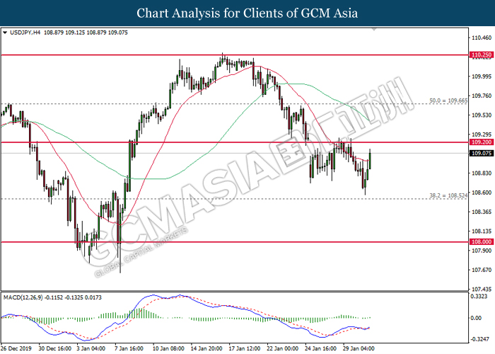USDJPY, H4: USDJPY was traded higher while currently testing the resistance level at 109.25. MACD which illustrate upward momentum suggests the pair to extend its gains after it successfully breakout above the resistance level at 109.25.