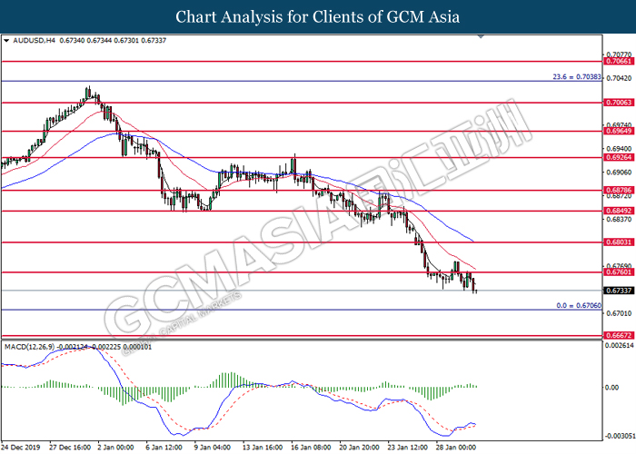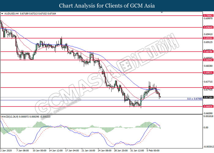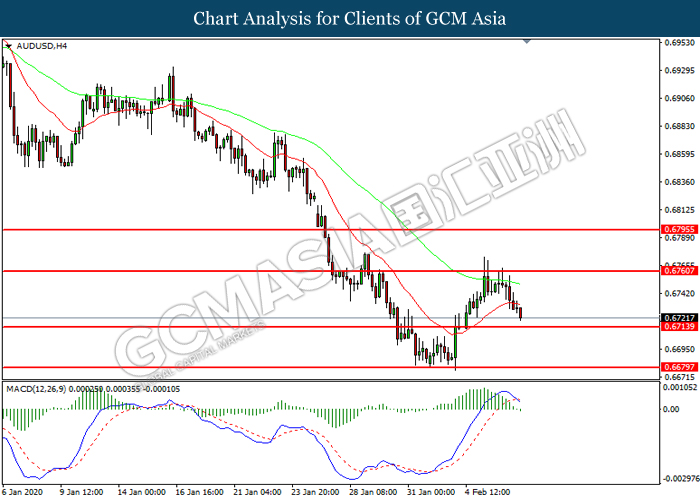 AUDUSD, H4: AUDUSD was traded lower following prior retracement from the resistance level at 0.6760. MACD which illustrate diminished upward momentum suggests the pair to extend its losses toward the support level at 0.6705.