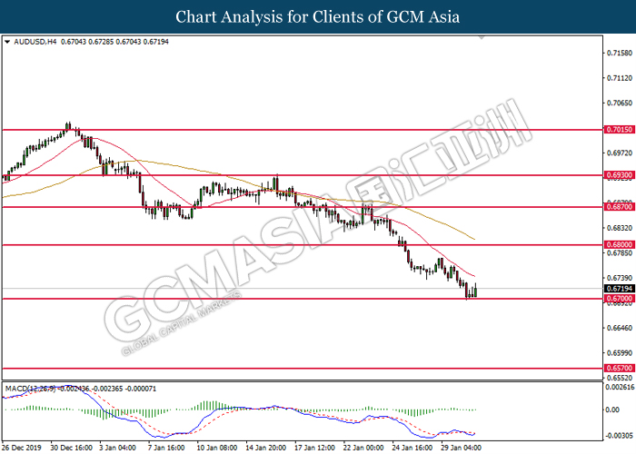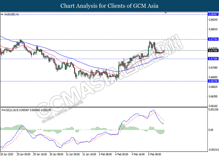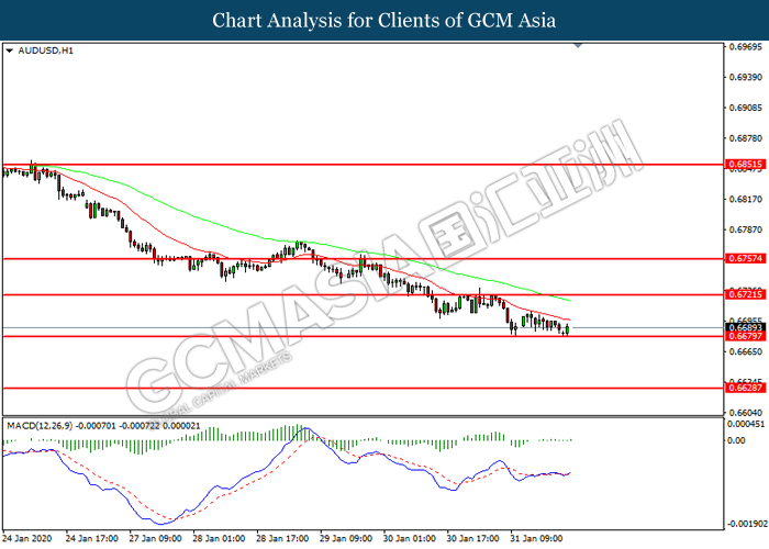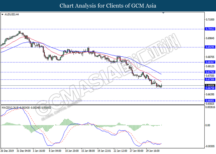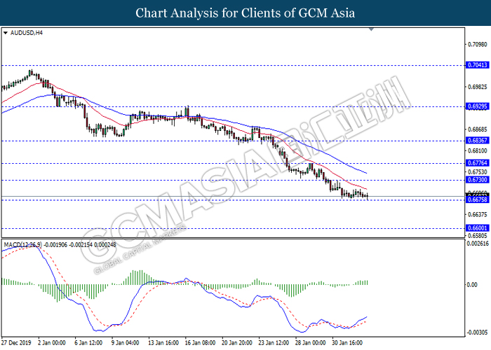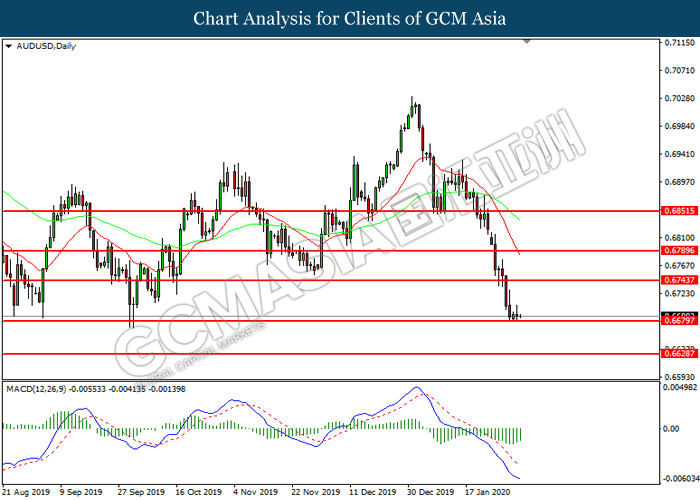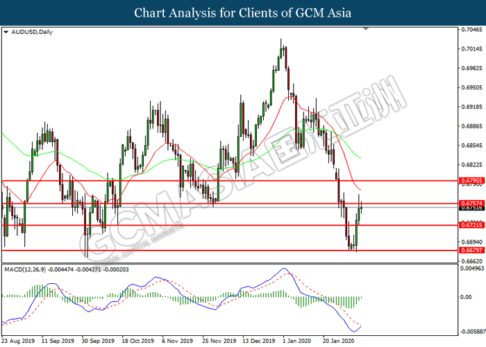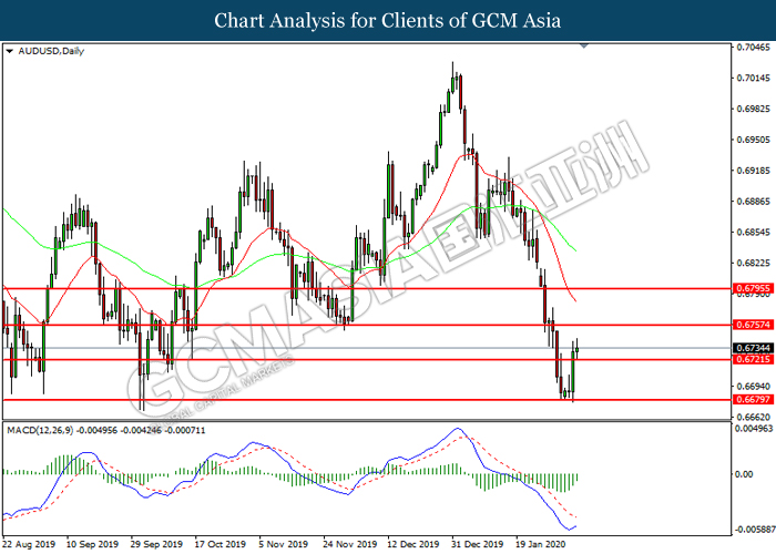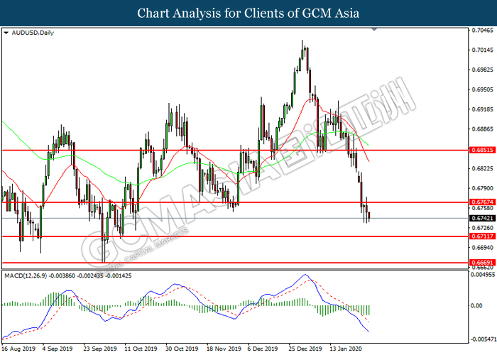 AUDUSD, Daily: AUDUSD was traded lower following prior breakout below the previous support level at 0.6765. However, MACD which illustrated diminishing bearish momentum suggest the pair to be traded higher in short-term as technical correction.