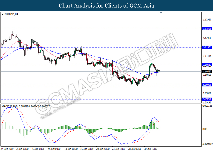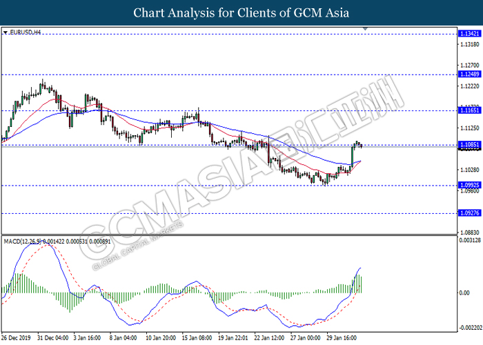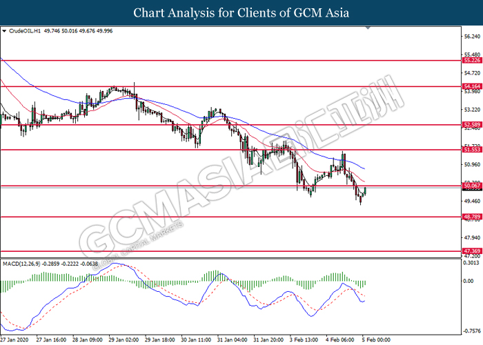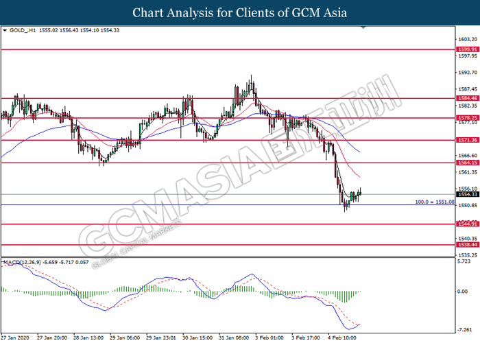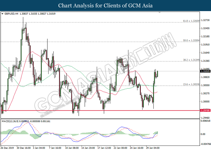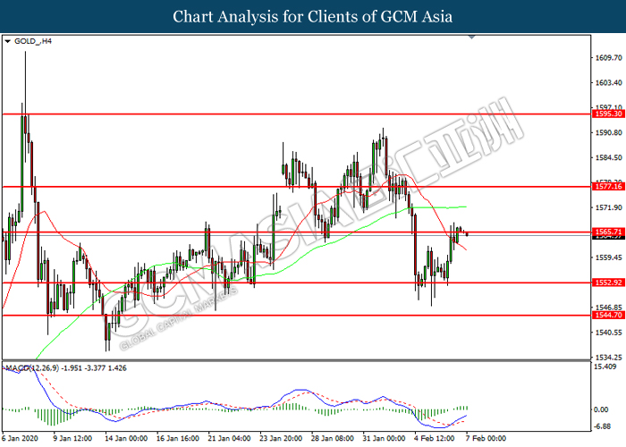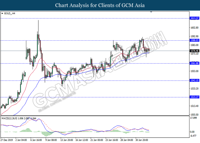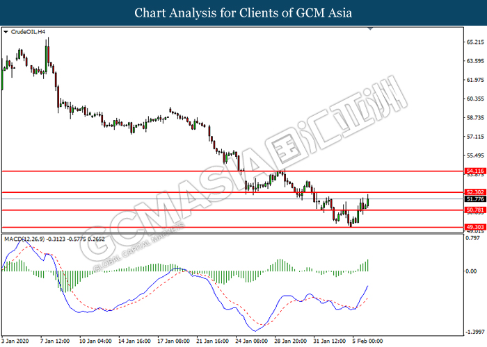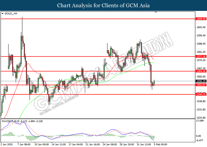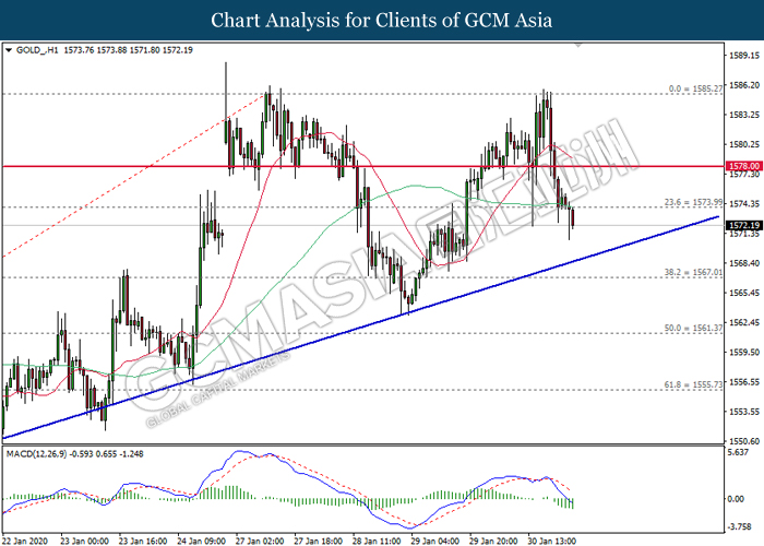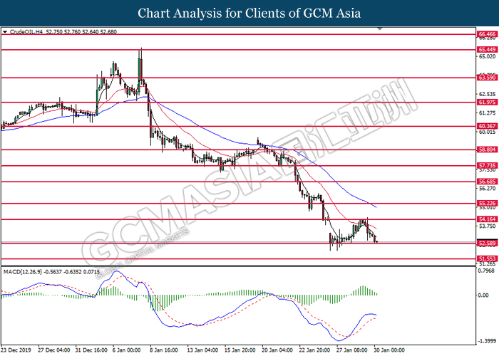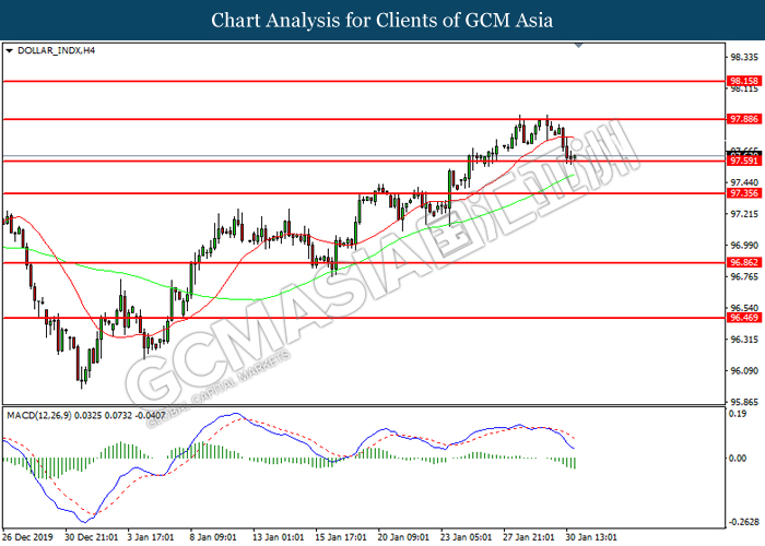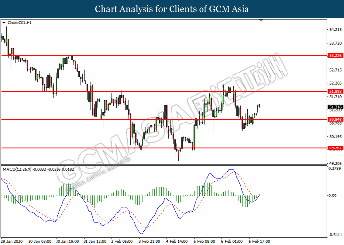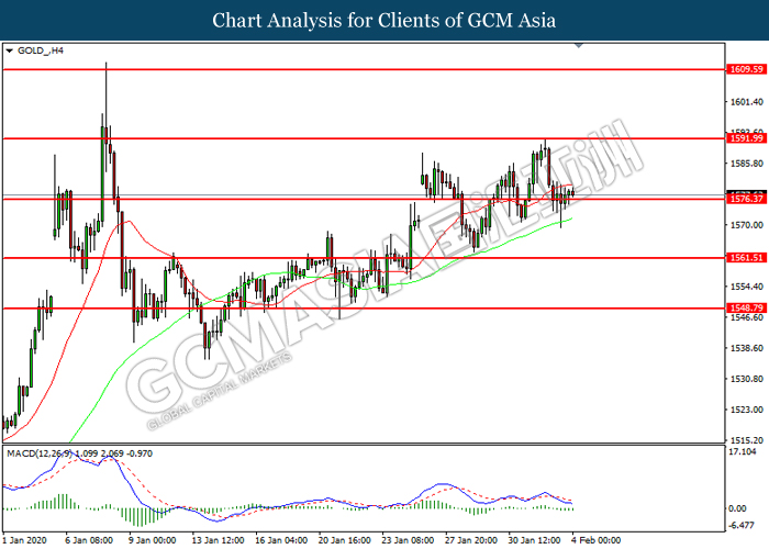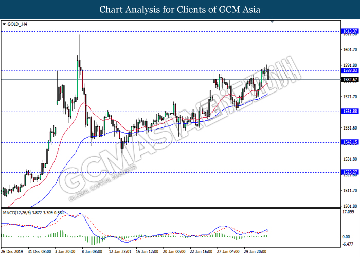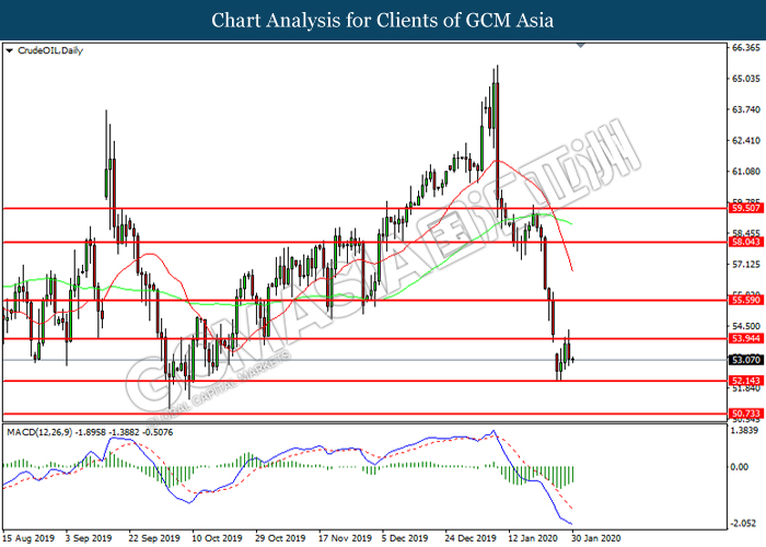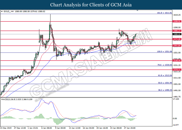 In the commodities market, the crude oil price surged 0.11% to $53.14 per barrels as of writing. However, the oil market edged lower yesterday following the crude oil data from the U.S. was released. According to Energy Information Administration (EIA), U.S. Crude Oil inventories had increased from the previous reading of -0.405M to 3.548M, higher than the market forecast at 0.482M while providing some bearish momentum on this black commodity. On the other hand, the gold price appreciated by 0.22% to $1579.87 per troy ounces amid to the risk-off sentiment in the markets due to the outbreak of the corona virus, which insinuating the demand for the safe-haven metal.