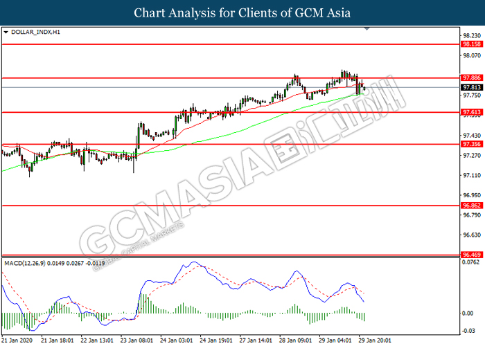 DOLLAR_INDX, H1: Dollar index was traded lower following prior retracement from the resistance level at 97.85. MACD which illustrated increasing bearish momentum suggest the index to extend its losses toward support level at 97.60.
