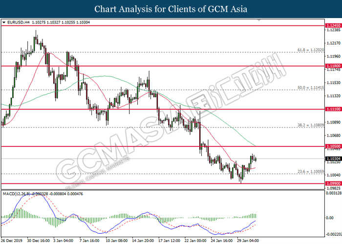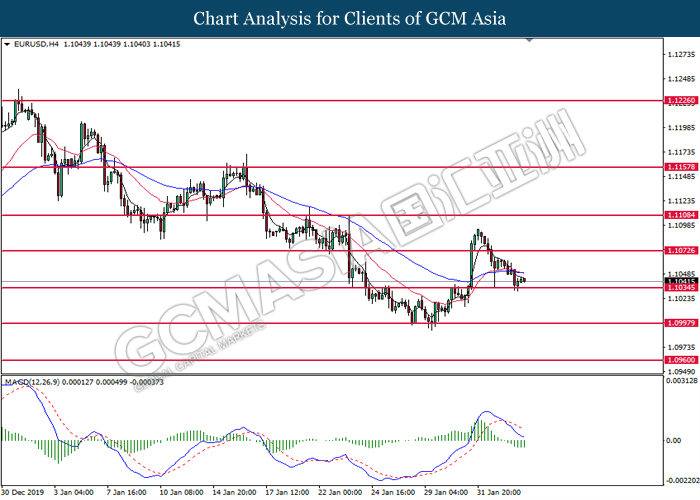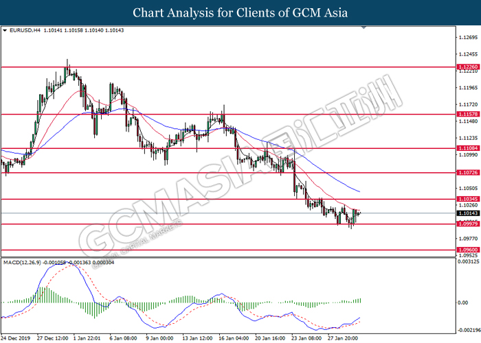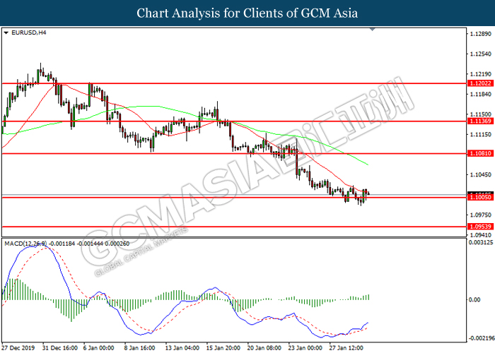 EURUSD, H4: EURUSD was traded within a range while currently testing the support level at 1.1005. MACD which illustrated increasing bullish momentum suggest the pair to be traded higher in short-term as technical correction.