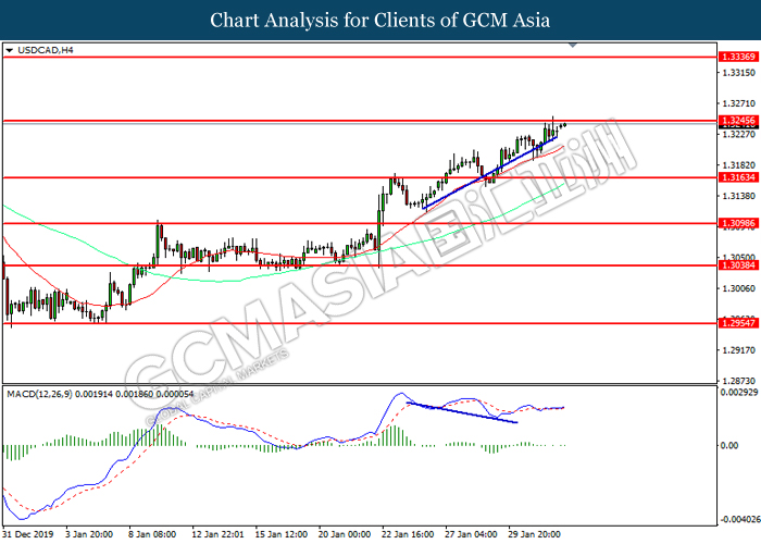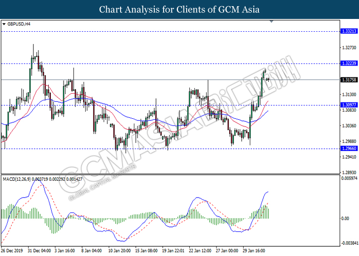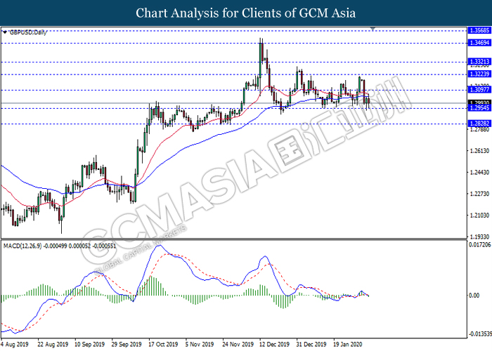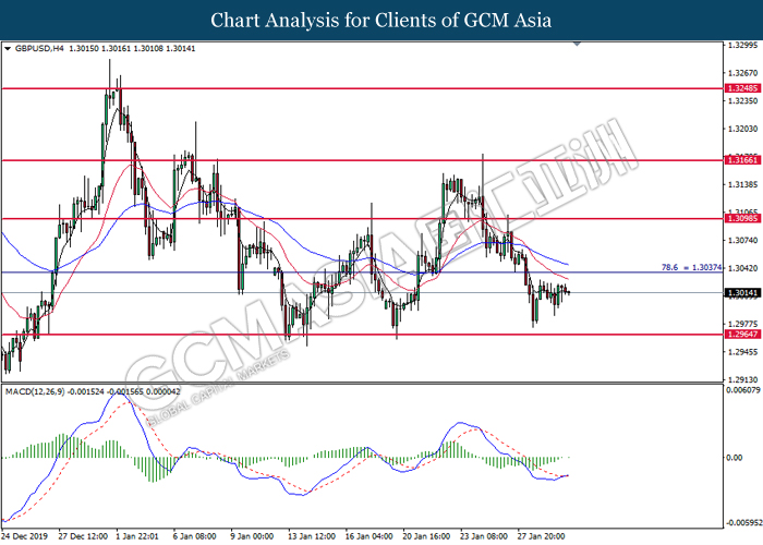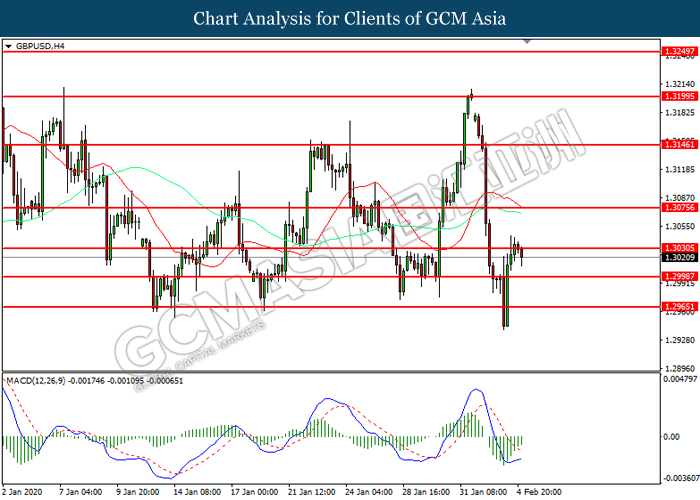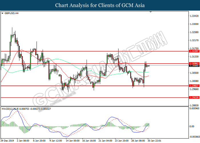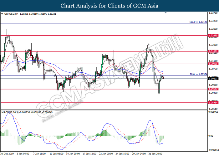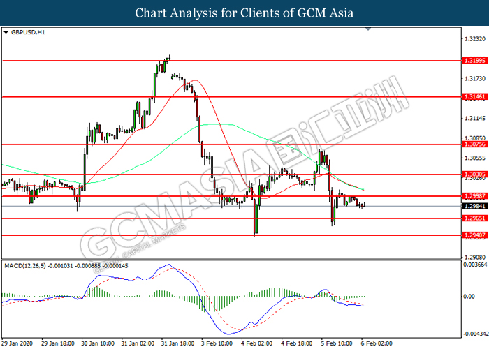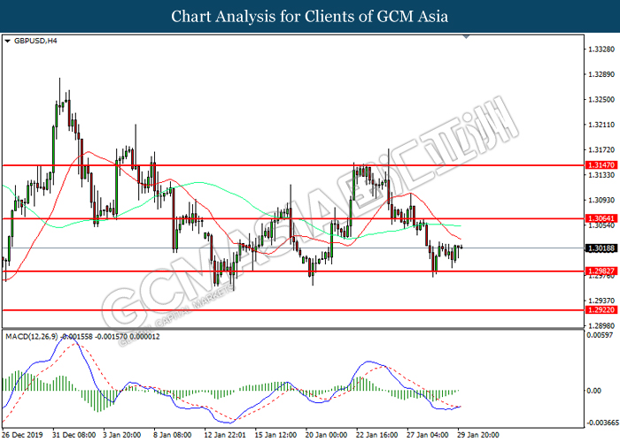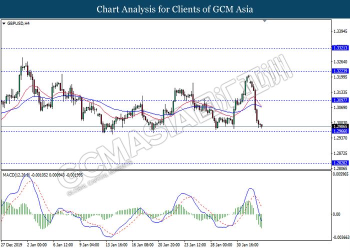 GBPUSD, H4: GBPUSD was traded higher following prior rebound from the support of 1.2965. MACD which illustrate diminished downward momentum suggests the pair to be traded higher in short-term.