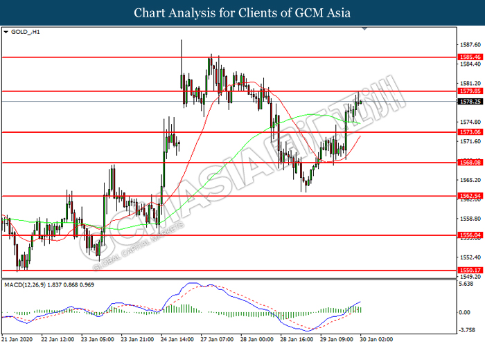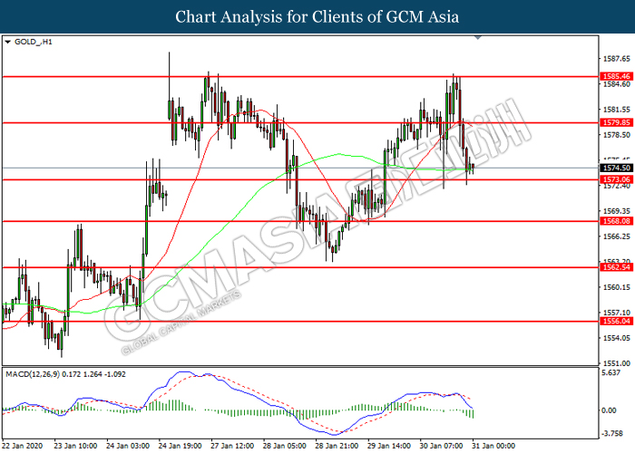 GOLD_, H1: Gold price was traded higher while currently near the resistance level at 1579.85. However, MACD which illustrated diminishing bullish momentum suggest the commodity to be traded lower in short-term as technical correction.