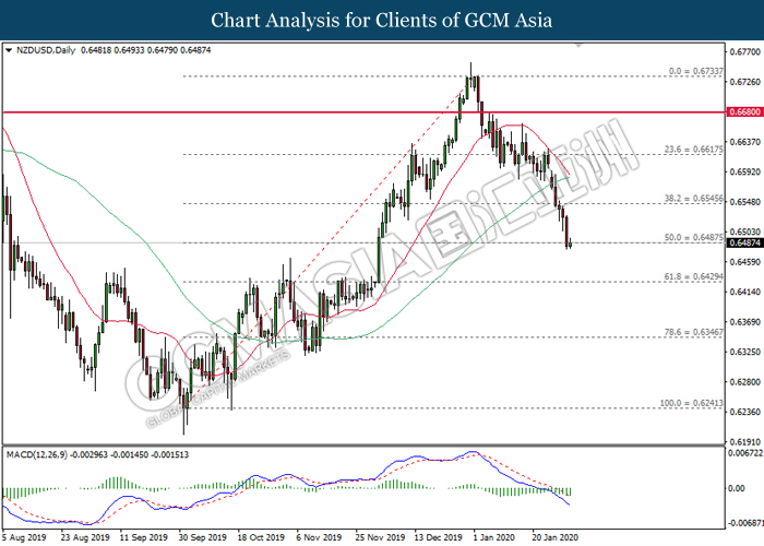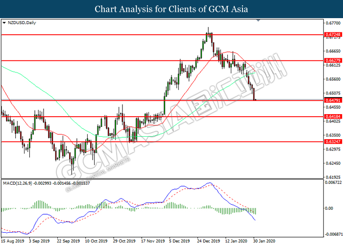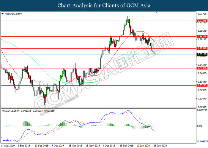 NZDUSD, Daily: NZDUSD was traded lower following prior breakout below the support level at 0.6655. MACD which illustrated increasing bearish momentum suggest the pair to extend its losses toward support level at 0.6435.