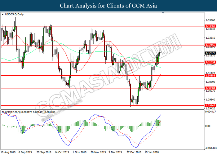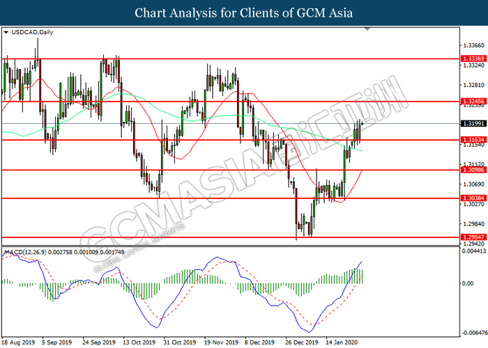 USDCAD, Daily: USDCAD was traded higher following prior breakout above the previous resistance level at 1.3165. However, MACD which illustrated diminishing bullish momentum suggest the pair to be traded lower in short-term as technical correction.