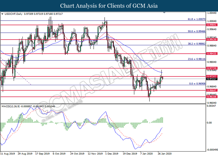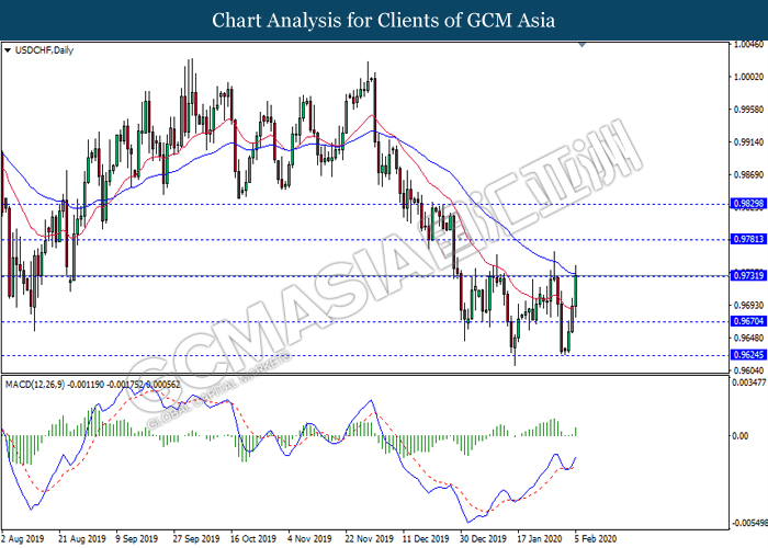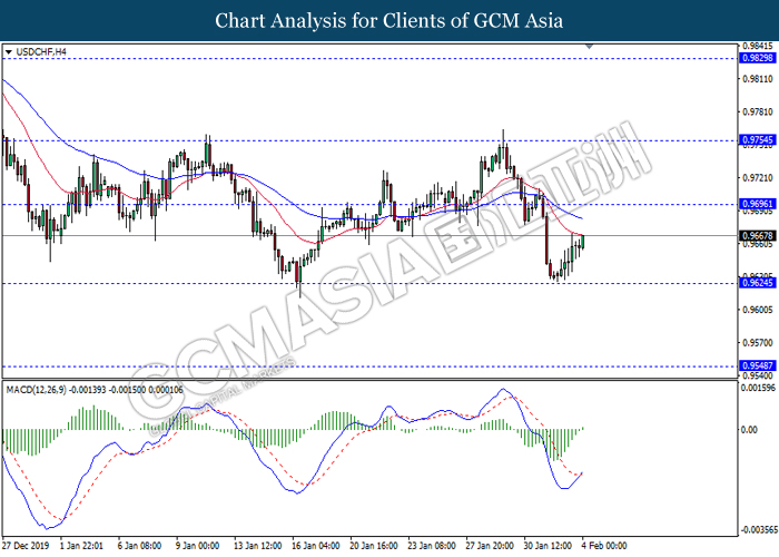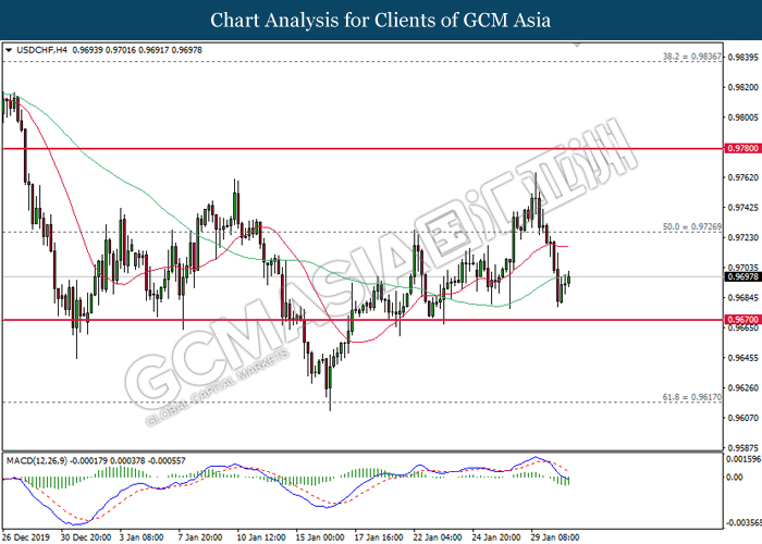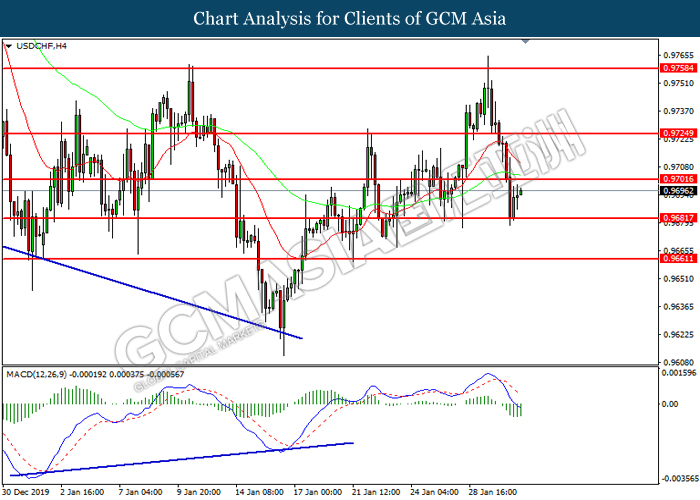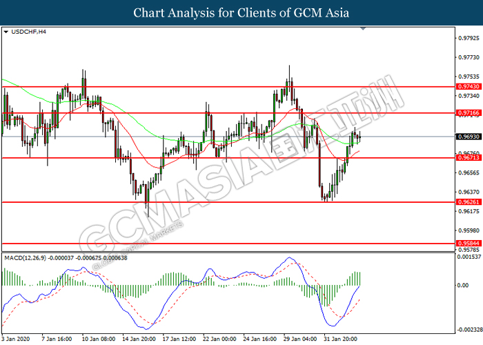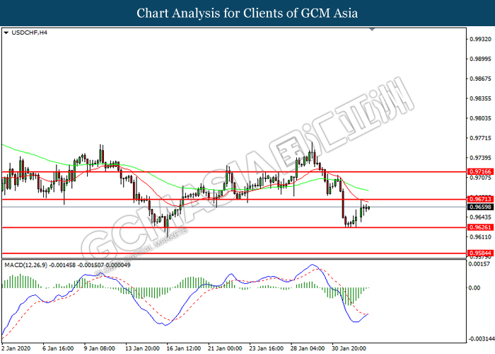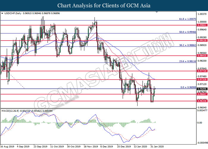USDCHF, H4: USDCHF was traded higher following prior rebound from the support level at 0.9680. MACD which illustrated diminishing bearish momentum suggest the pair to extend its gains toward resistance level at 0.9700.