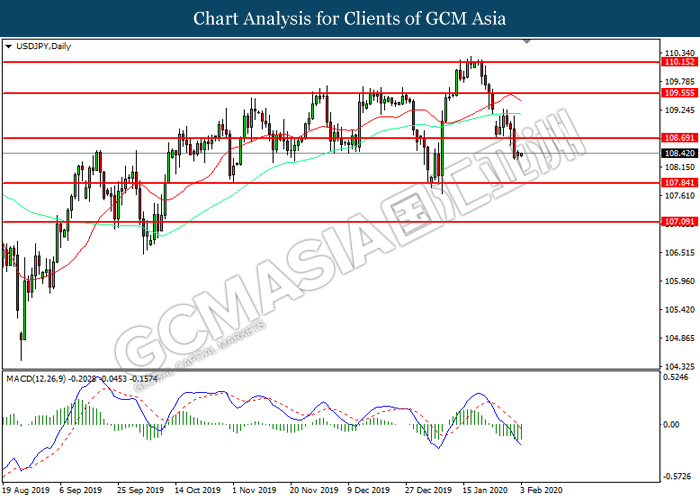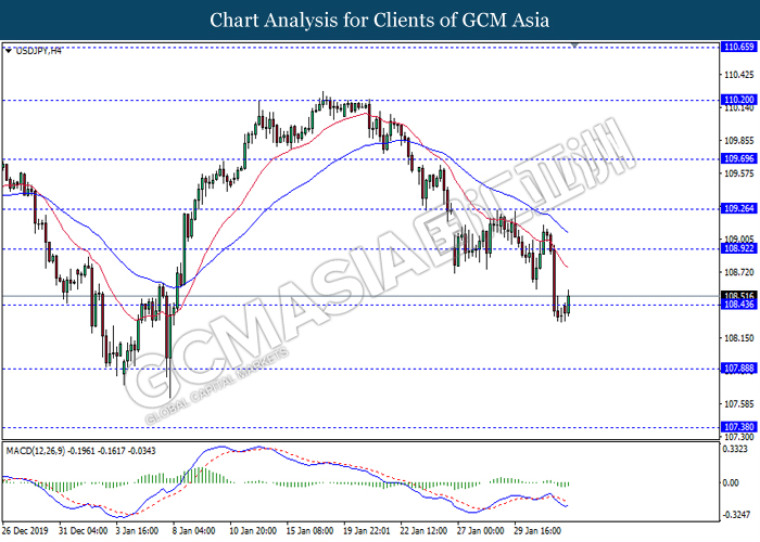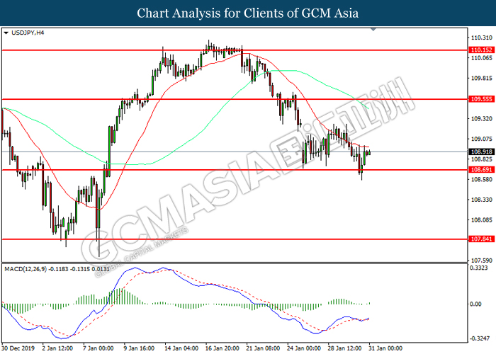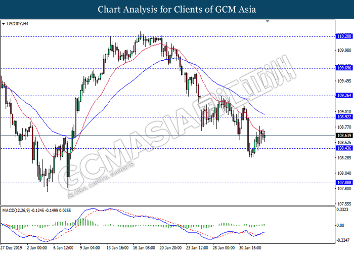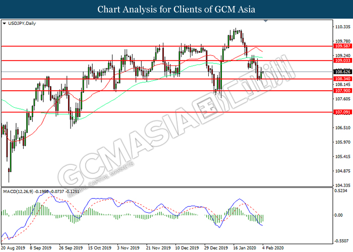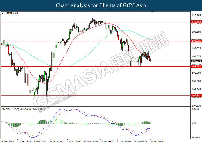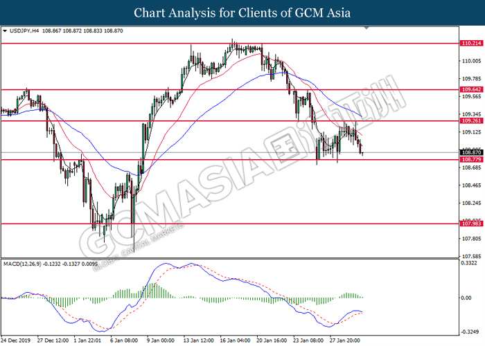USDJPY, H4: USDJPY was traded lower while currently testing near the support level at 108.80. MACD which illustrate diminished upward momentum suggests the pair to extend its losses after it successfully breakout below the support level at 108.75.
