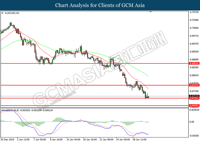 AUDUSD, H4: AUDUSD was traded lower while currently testing the support level at 0.6715. MACD which illustrated diminishing bullish momentum suggest the pair to extend its losses after it successfully breakout below the support level.