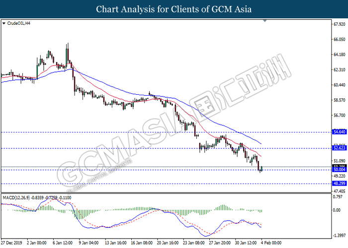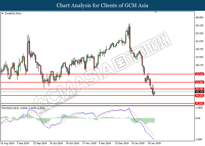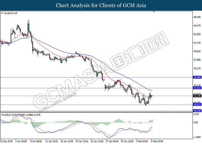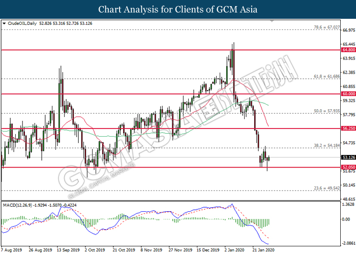CrudeOIL, Daily: Crude oil price was traded lower following prior retracement from the resistance level at 53.95. However, MACD which illustrated diminishing bearish momentum suggest the commodity to be traded higher in short-term as technical correction.