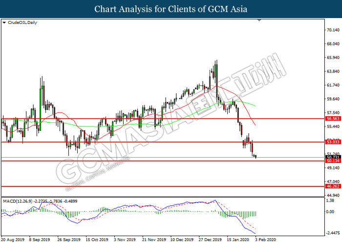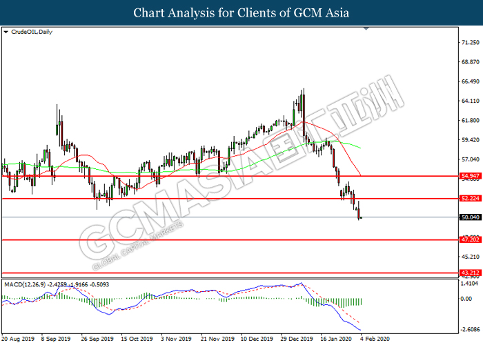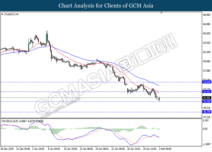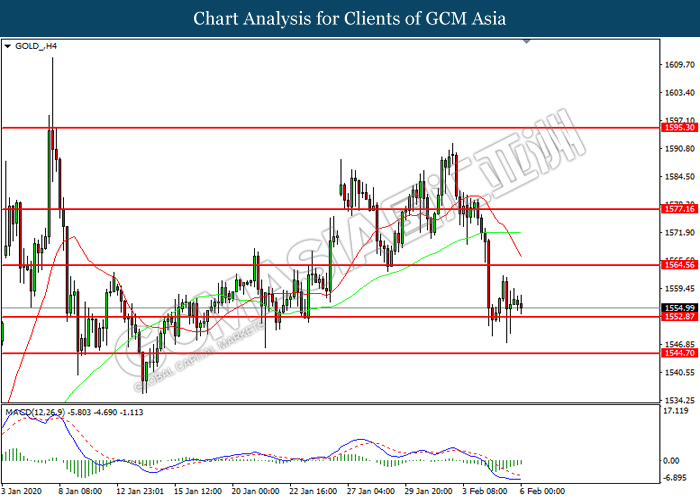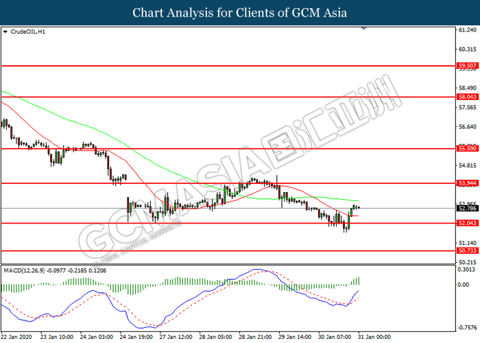 As for commodities, crude oil price plunged by 0.49% to $52.80 per barrel. Oil futures received extensive selloff pressure following higher death tolls from the new coronavirus in China which may dampen global economic momentum as well as their demand towards crude oil. On the other hand, gold price rose 0.22% to $1,580.14 a troy ounce following higher risk aversion due to the spread of coronavirus.