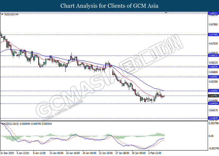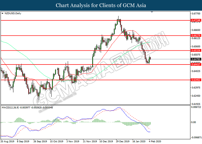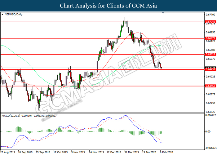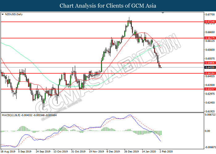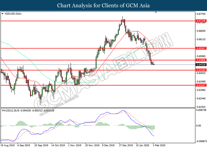 NZDUSD, Daily: NZDUSD was traded lower while currently testing the support level at 0.6445. However, MACD which illustrated diminishing bearish momentum suggest the pair to be traded higher in short-term as technical correction.