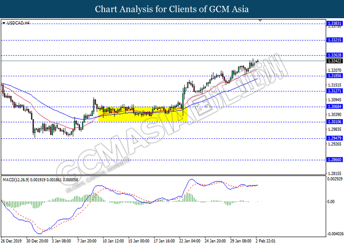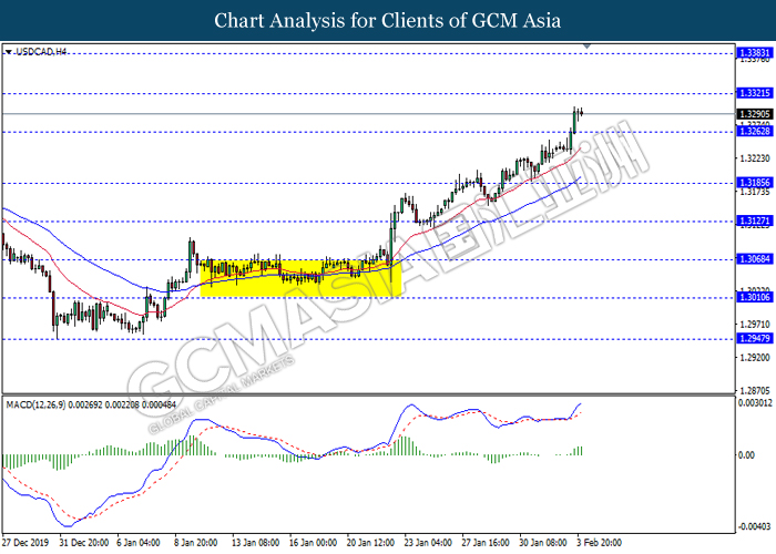 GBPUSD, H4: GBPUSD was traded higher following prior rebound from the support of 1.2965. MACD which illustrate diminished downward momentum and the formation of golden cross suggests the pair to be traded higher in short-term.