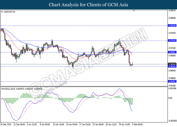 USDCHF, H4: USDCHF was traded lower while currently testing the support level at 0.9725. MACD which illustrated diminishing bullish momentum suggest the pair to extend its losses after it successfully breakout below the support level.