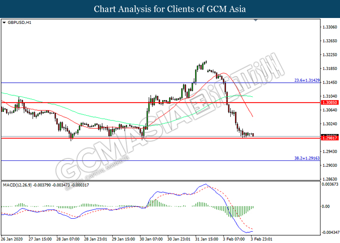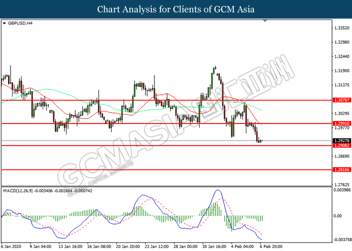 GBPUSD, H4: GBPUSD was traded lower while currently testing the support level at 1.2910. However, MACD which illustrated diminishing bearish momentum suggest the pair to be traded higher in short-term as technical correction.