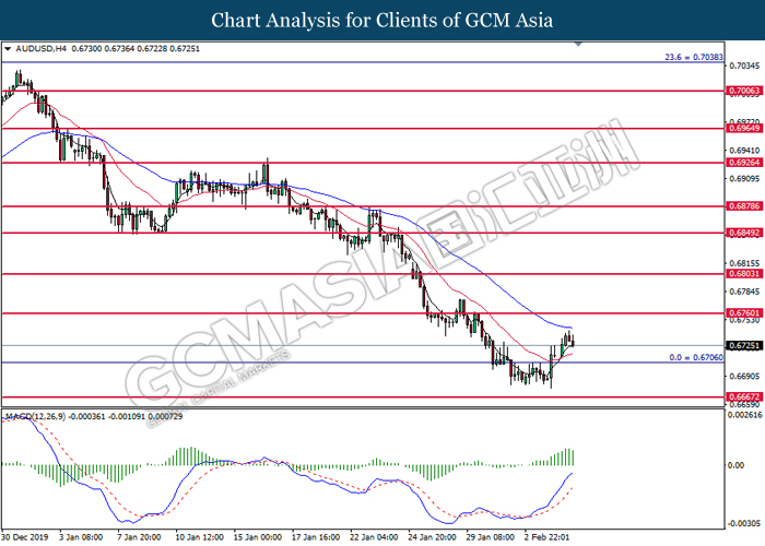 AUDUSD, H4: AUDUSD was traded higher while currently testing the resistance level at 0.6770. MACD which illustrate diminished downward momentum suggests the pair to extend its gains after it successfully breakout above the resistance level at 0.6770.