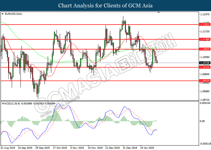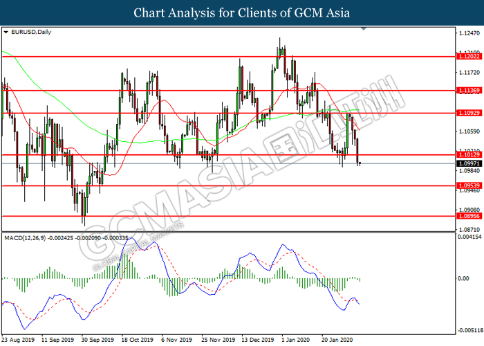 EURUSD, Daily: EURUSD was traded lower following prior breakout below the previous support level at 1.1015. MACD which illustrated increasing bearish momentum suggest the pair to extend its losses toward support level at 1.0955.