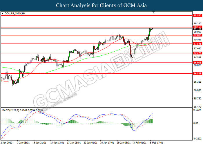 DOLLAR_INDX, H4:Dollar index was traded higher while currently testing the resistance level at 98.15. MACD which illustrated increasing bullish momentum suggest the index to extend its gains after it successfully breakout above the resistance level.