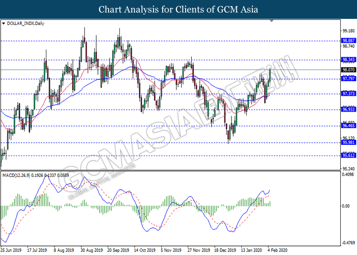 The dollar index which measured against its basket of six major currency pair have continue to edge higher following hopes of economic impact from the coronavirus could be limited. According to the latest update, the death toll have increased another 73 people from the Chinese mainland which bring the total death toll to 563 while total number of infections stand at 28018. Despite this, global drugmakers and World Health Organization (WHO) have provide some positive reports on one step closer towards the cure. At the same time, the World Health Organization (WHO) expressed its confidence that the virus spread could be contained as it pointed out 99% of the cases are in China so far. The reports have help in easing market concerns and boosted market confidence towards the dollar. At the time of writing, dollar index rose 0.06% to 98.11 as of writing.