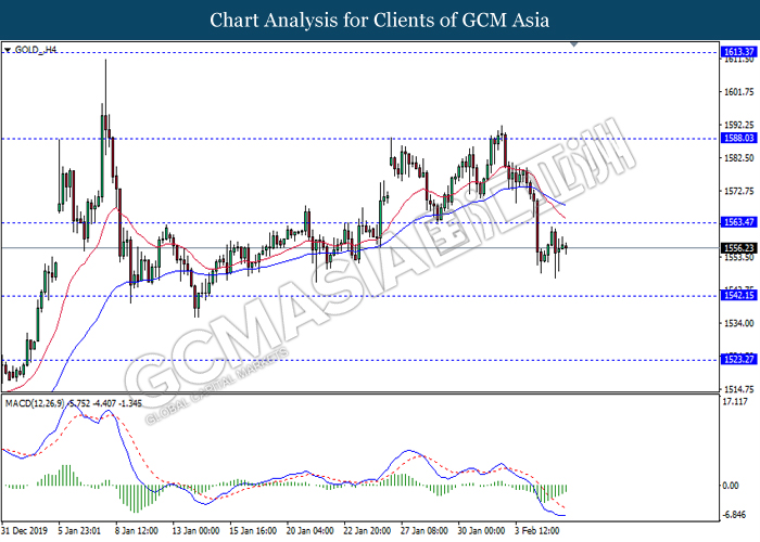 In the commodities market, crude oil price appreciates by 0.30% to $54.10 per barrel as markets believe OPEC and its allies will further extend its oil production cut before the end of March. Besides, trade tensions eased also further supporting this black commodity from falling while market are still awaiting for more progress in trade talk between US and China. On the other hand, gold price inched down 0.04% to $1,565.20 a troy ounce as US dollar strengthen.