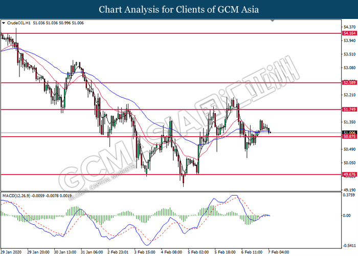 CrudeOIL, H1: Crude oil price was traded higher following prior rebound from the support level at 50.85. MACD which illustrated diminishing bearish momentum suggest the commodity to extend its gains toward resistance level at 51.90.