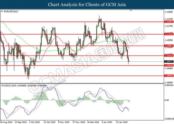 EURUSD, Daily: EURUSD was traded lower following prior breakout below the previous support level at 1.1010. MACD which illustrated increasing bearish momentum suggest the pair to extend its losses toward support level at 1.0955.