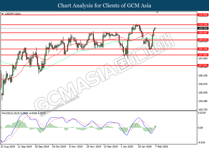 USDJPY, Daily: USDJPY was traded higher following prior breakout above the previous resistance level at 109.60. MACD which illustrated increasing bullish momentum suggest the pair to extend its gains toward resistance level at 110.20.