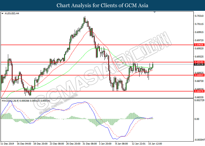 AUDUSD, H4: AUDUSD was traded higher while currently testing the resistance level at 0.6920. MACD which illustrated increasing bullish momentum suggest the pair to extend its gains after it successfully breakout above the resistance level.