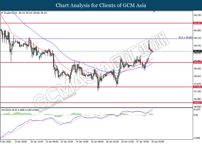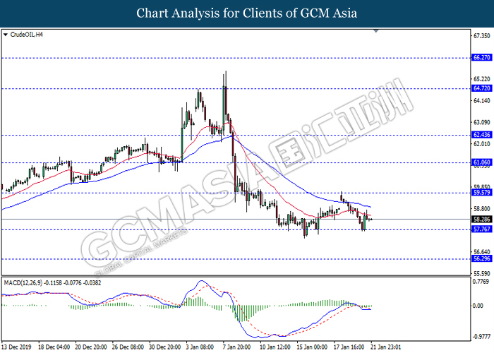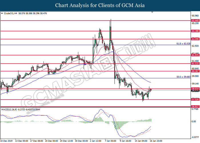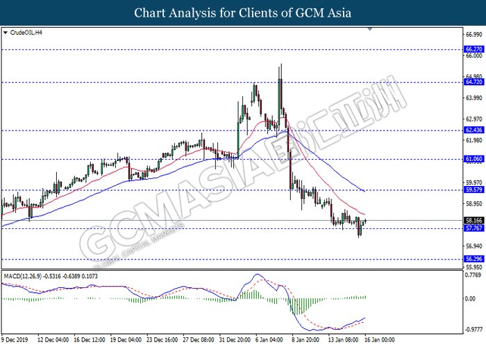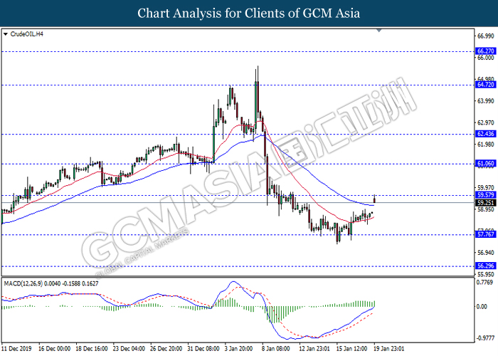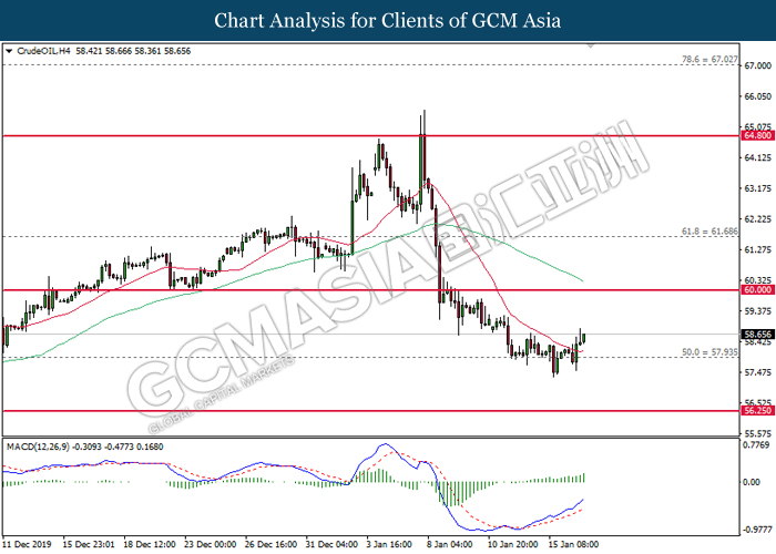 CrudeOIL, H4: Crude oil was traded higher following prior rebound from 57.95. MACD which illustrate bullish signal suggests its price to be traded higher in short-term.